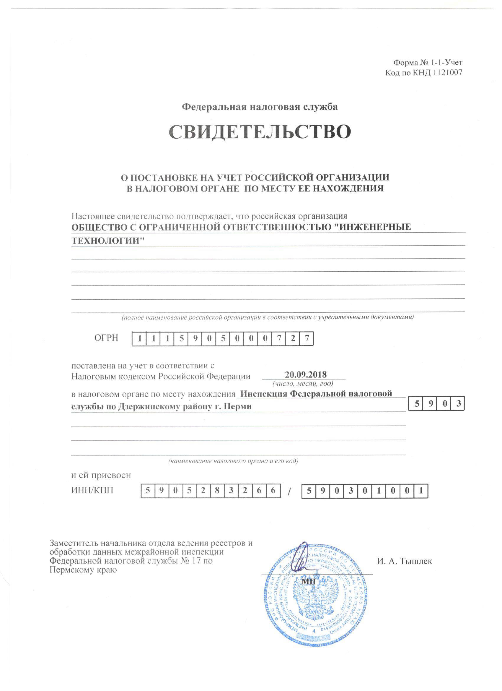 Свидетельство ОГРН / ИНН / КПП 20.09.2018
